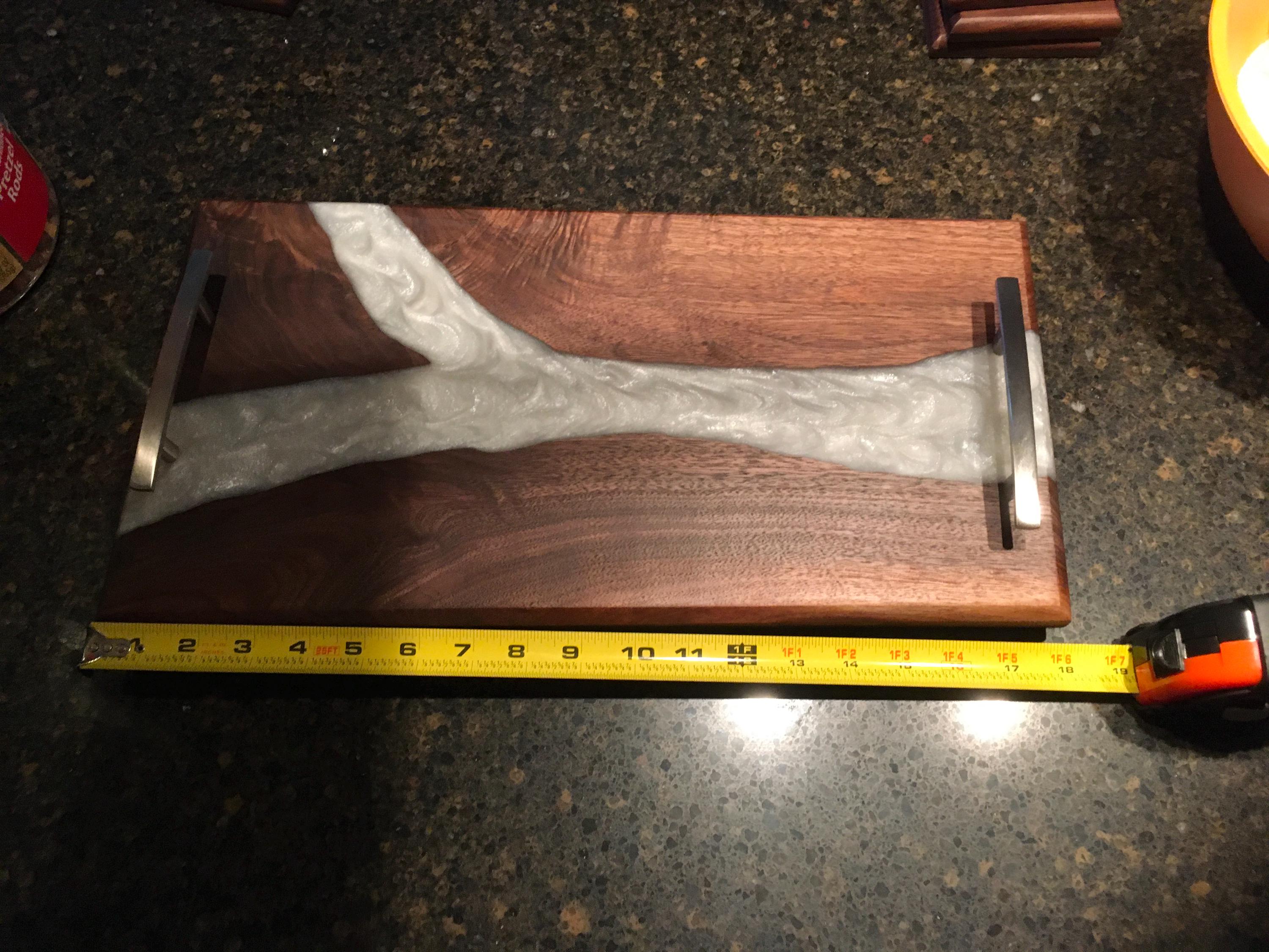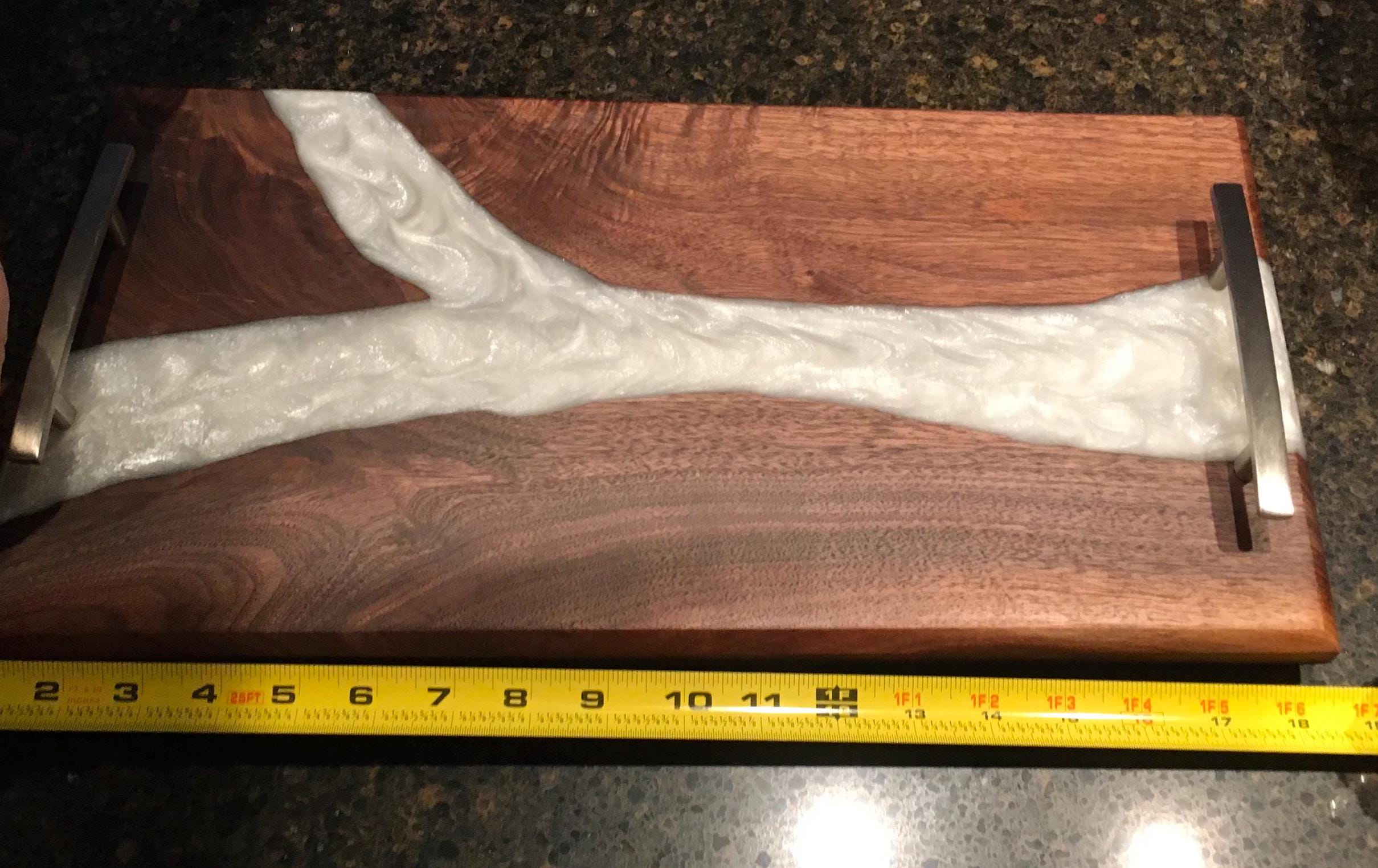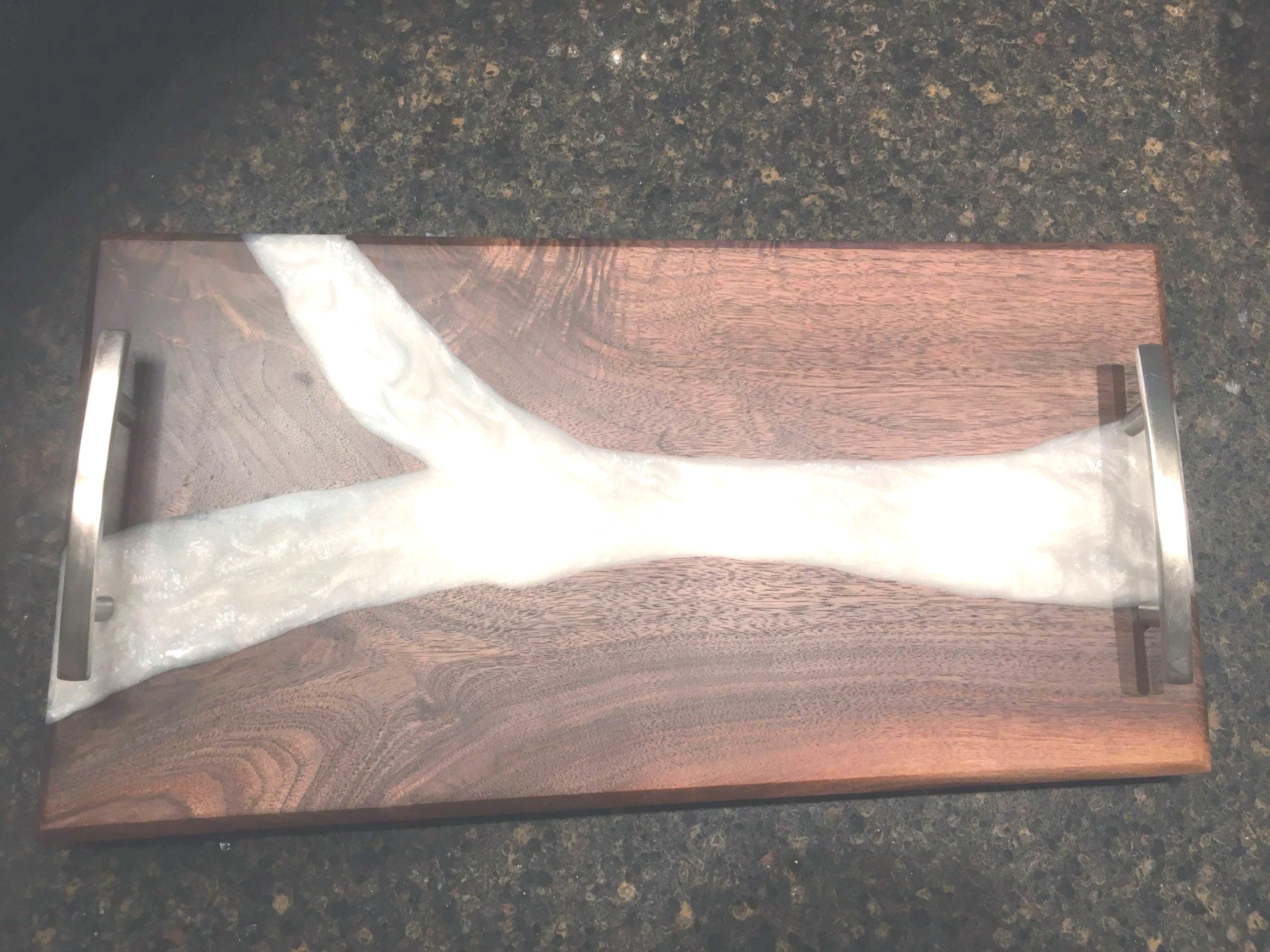 Black Walnut Charcuterie board, serving board, cheese board, or bar board with a beautiful pearl white food safe epoxy river running through the board. Comes with polished metal handles and plastic black feet. Great for any occasion. Makes a great gift.