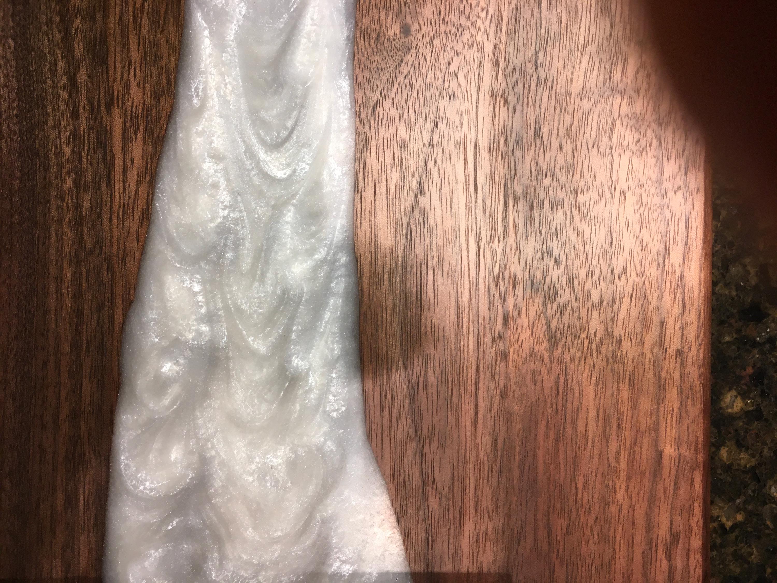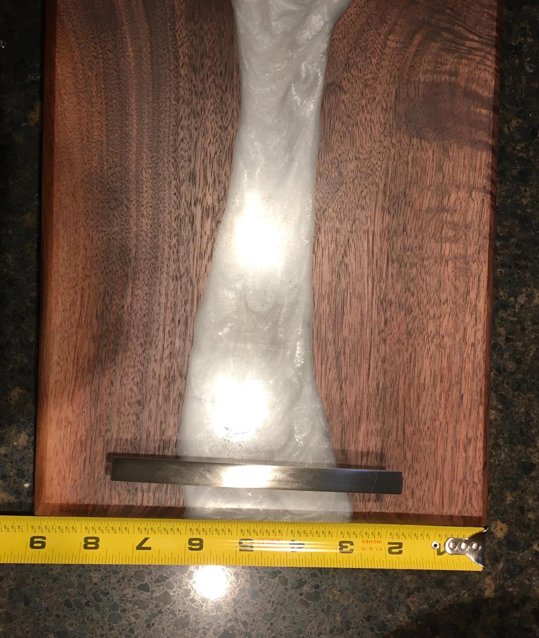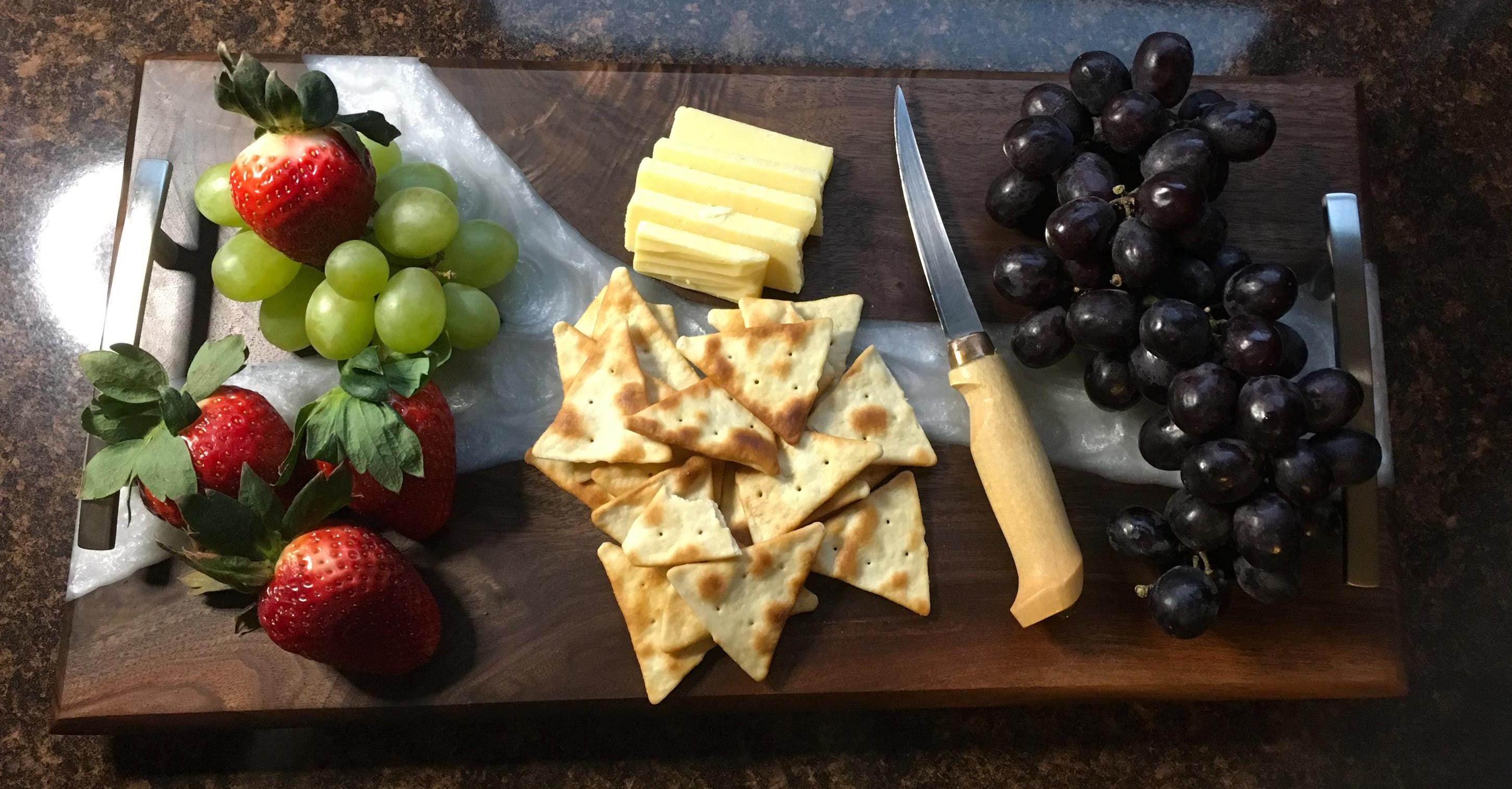 Black Walnut Charcuterie board, serving board, cheese board, or bar board with a beautiful pearl white food safe epoxy river running through the board. Comes with polished metal handles and plastic black feet. Great for any occasion. Makes a great gift.