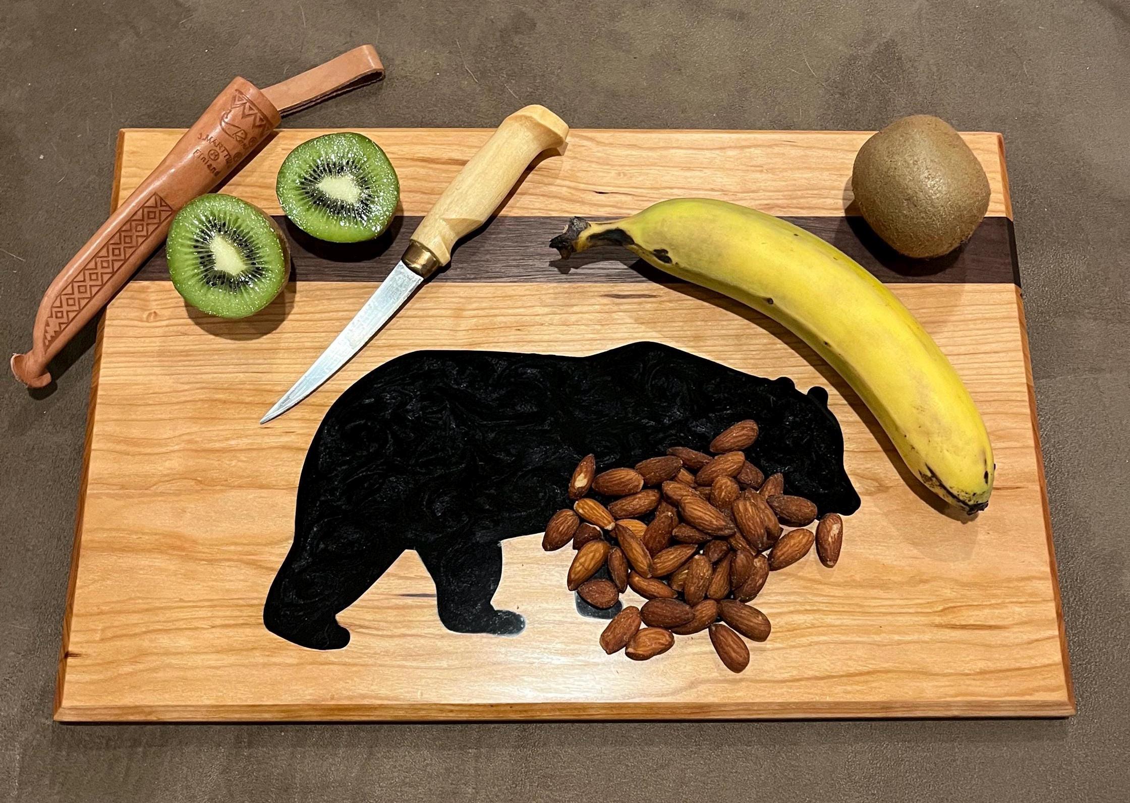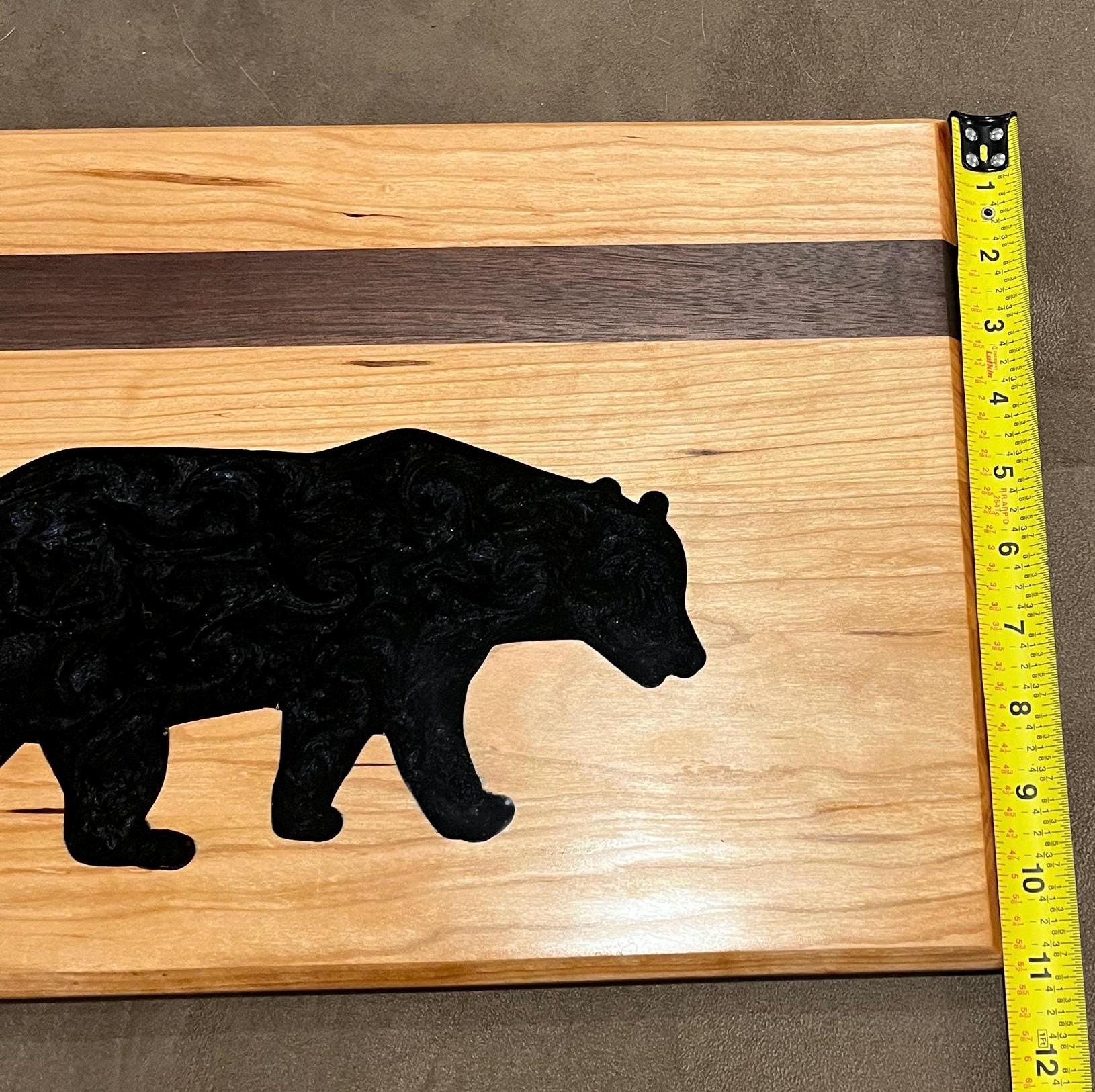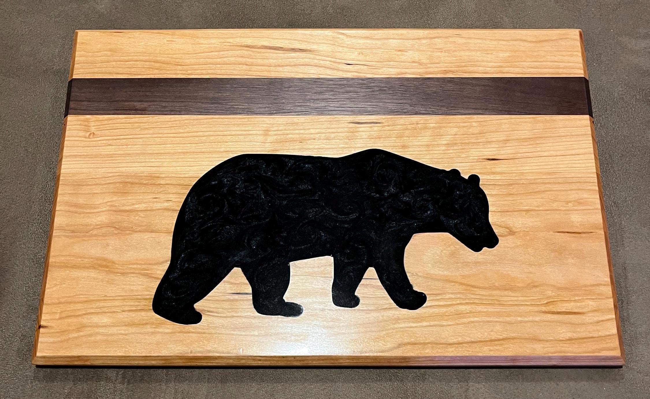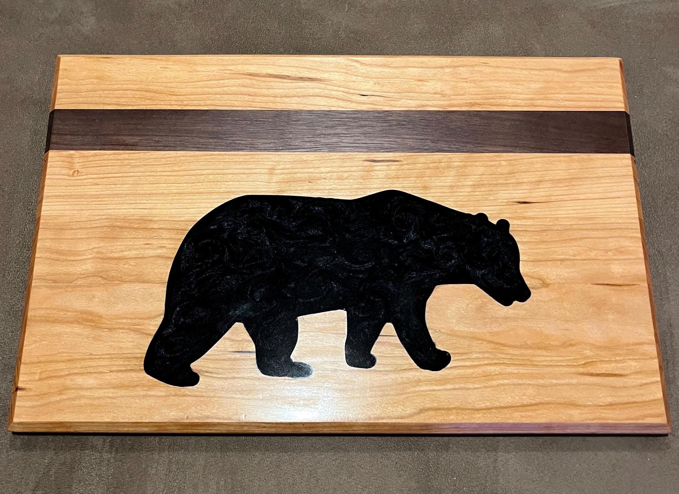 This is a beautiful charcuterie board, cheese board, or serving tray made with cherry and black walnut. Has an image of a black bear in the middle that was cut with a router and filed with black epoxy. I also put custom swirl marks to make the bear pop. Great for any occasion. Treated with mineral oil and bees wax.