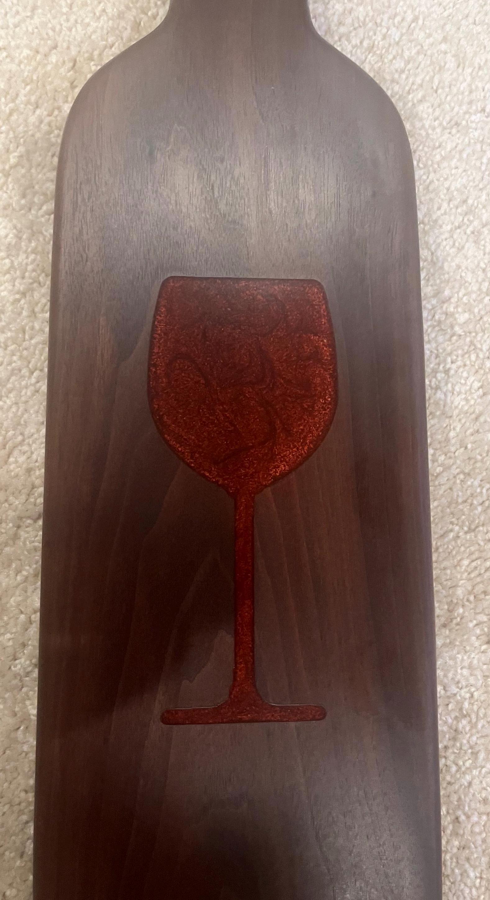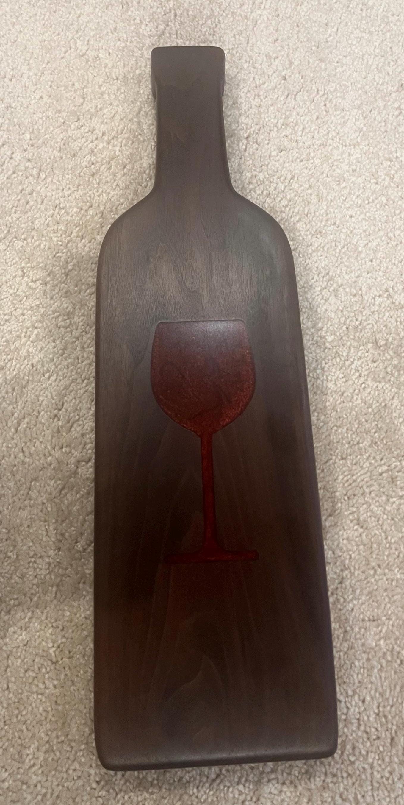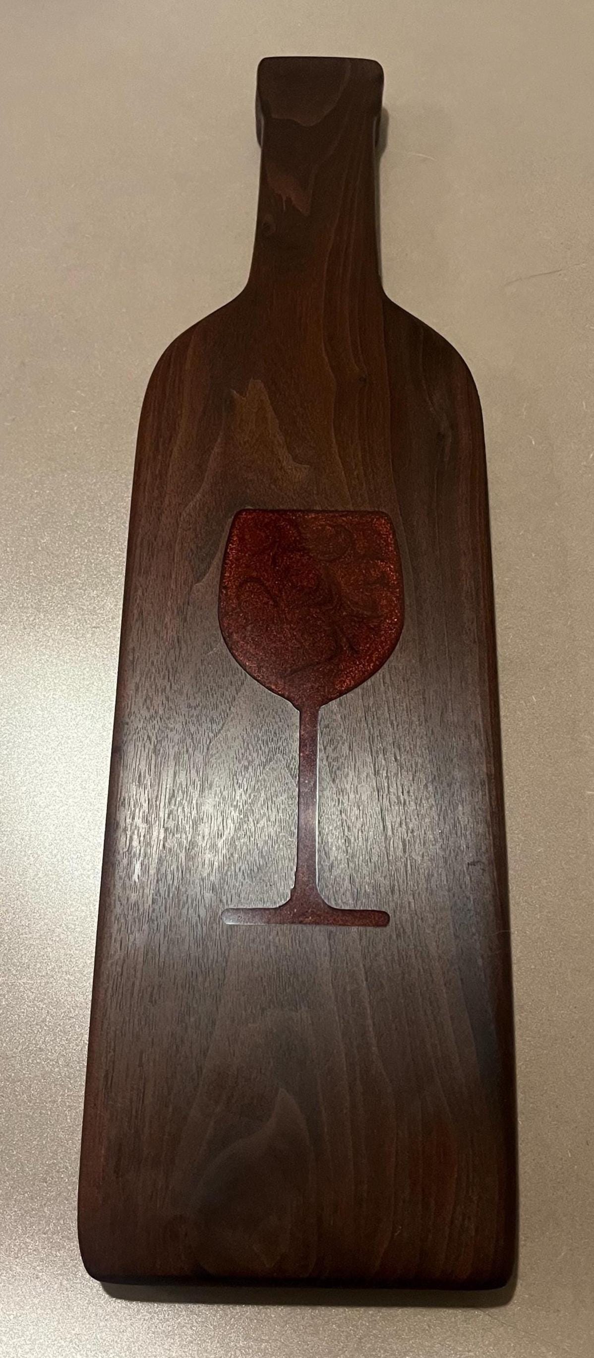This is a beautiful wine bottle shaped charcuterie board, serving tray, or cheese board. Made with walnut wood and has a wine glass shape with merlot colored epoxy. Great for any occasion. Makes a great gift.