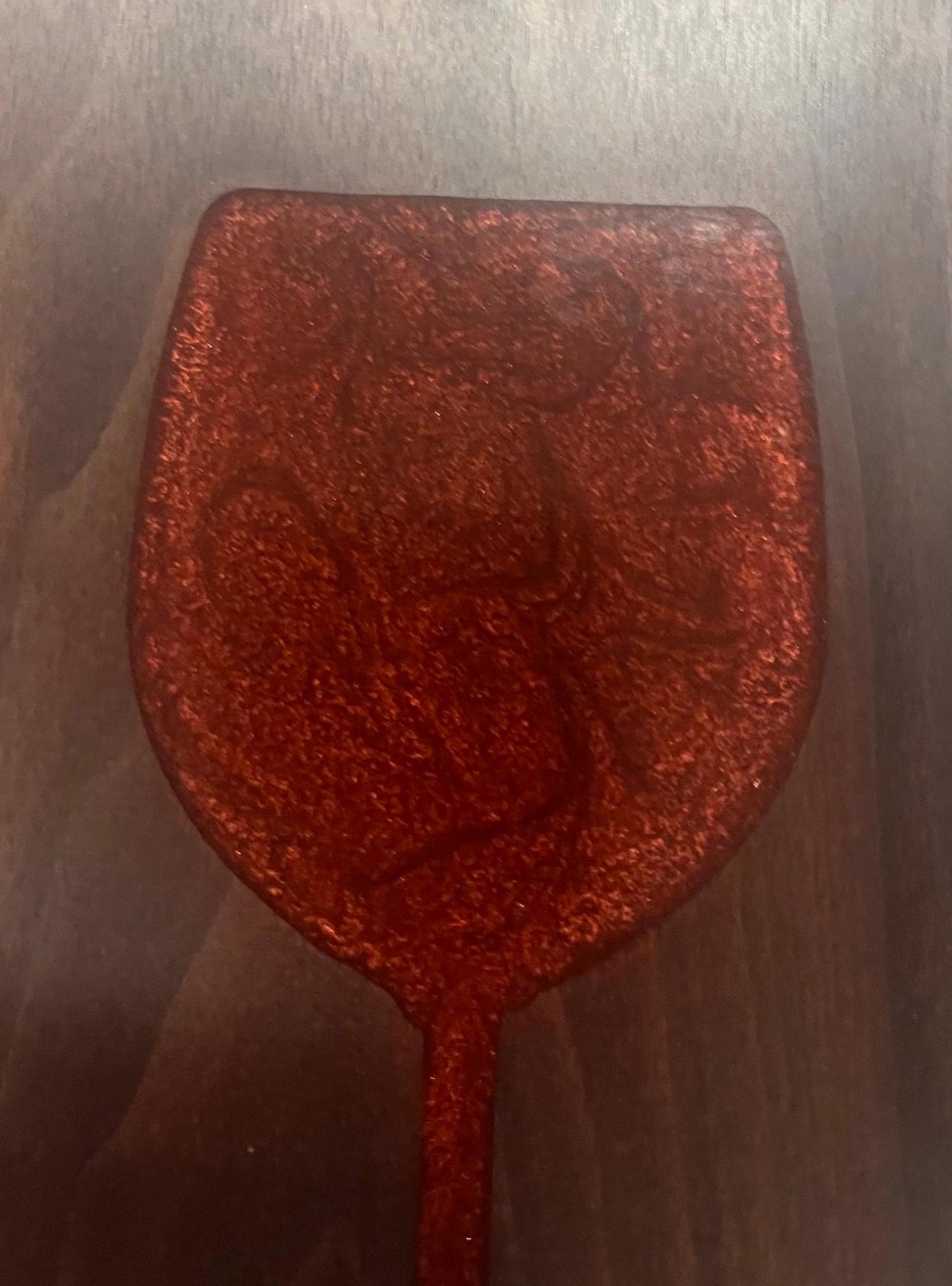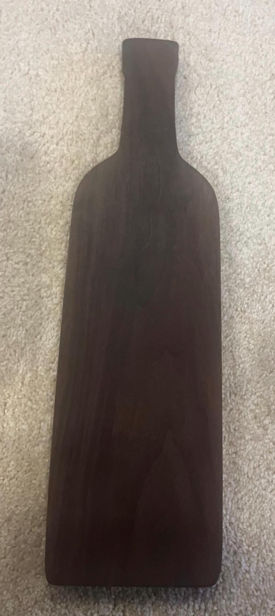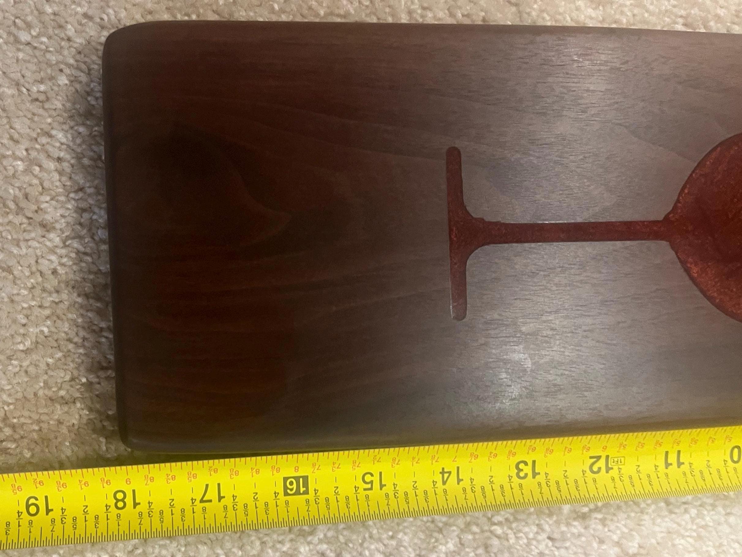 This is a beautiful wine bottle shaped charcuterie board, serving tray, or cheese board. Made with walnut wood and has a wine glass shape with merlot colored epoxy. Great for any occasion. Makes a great gift.