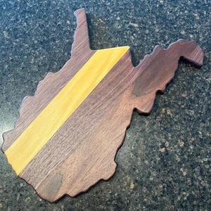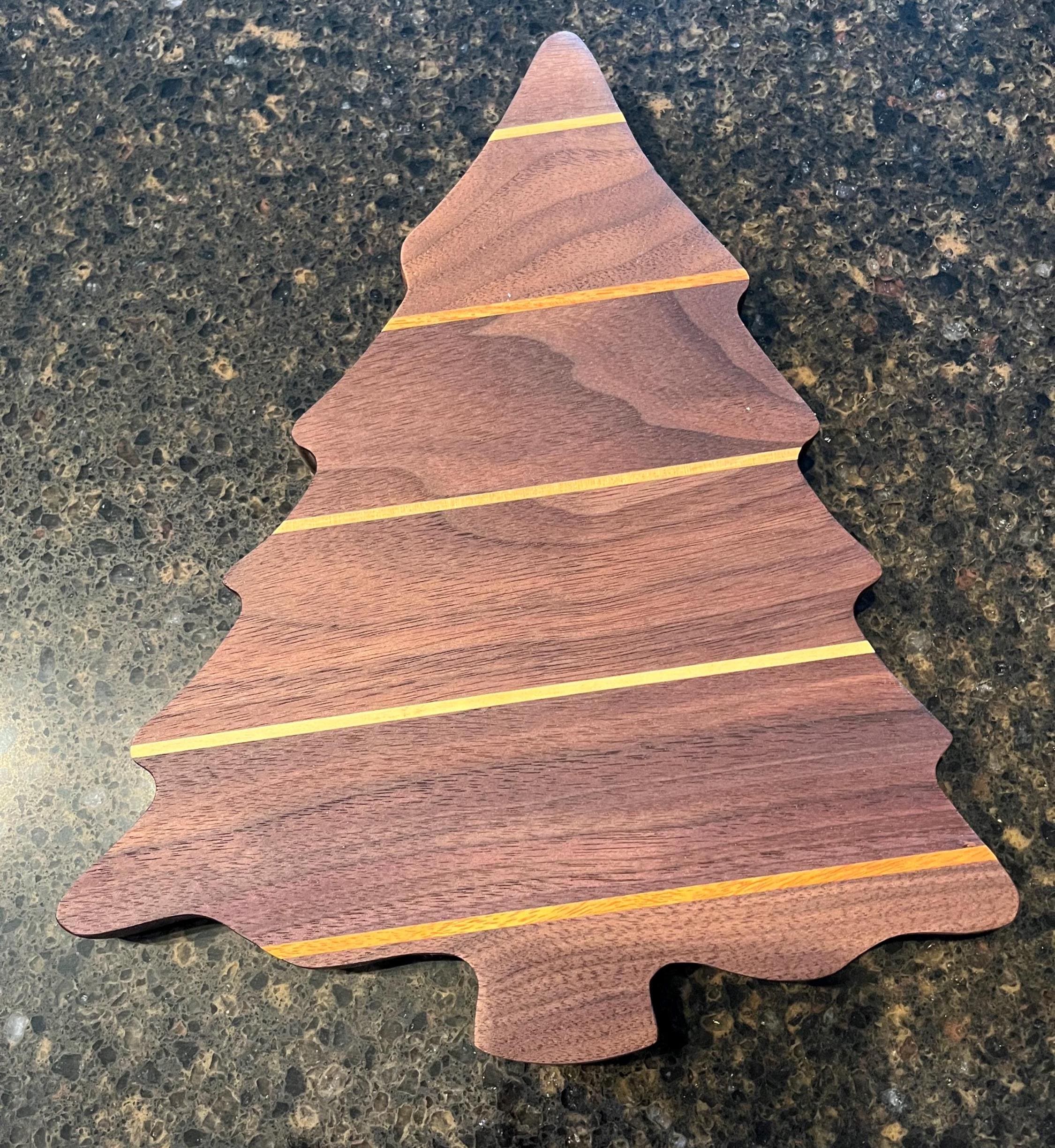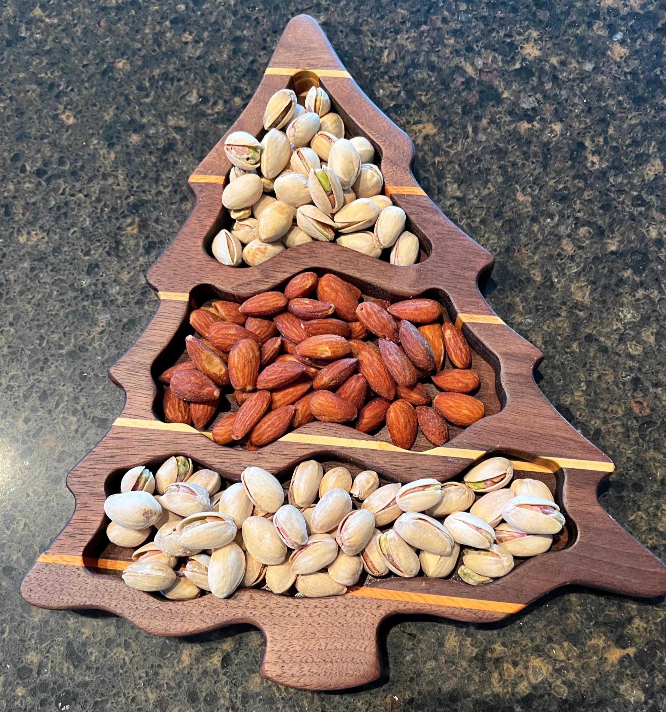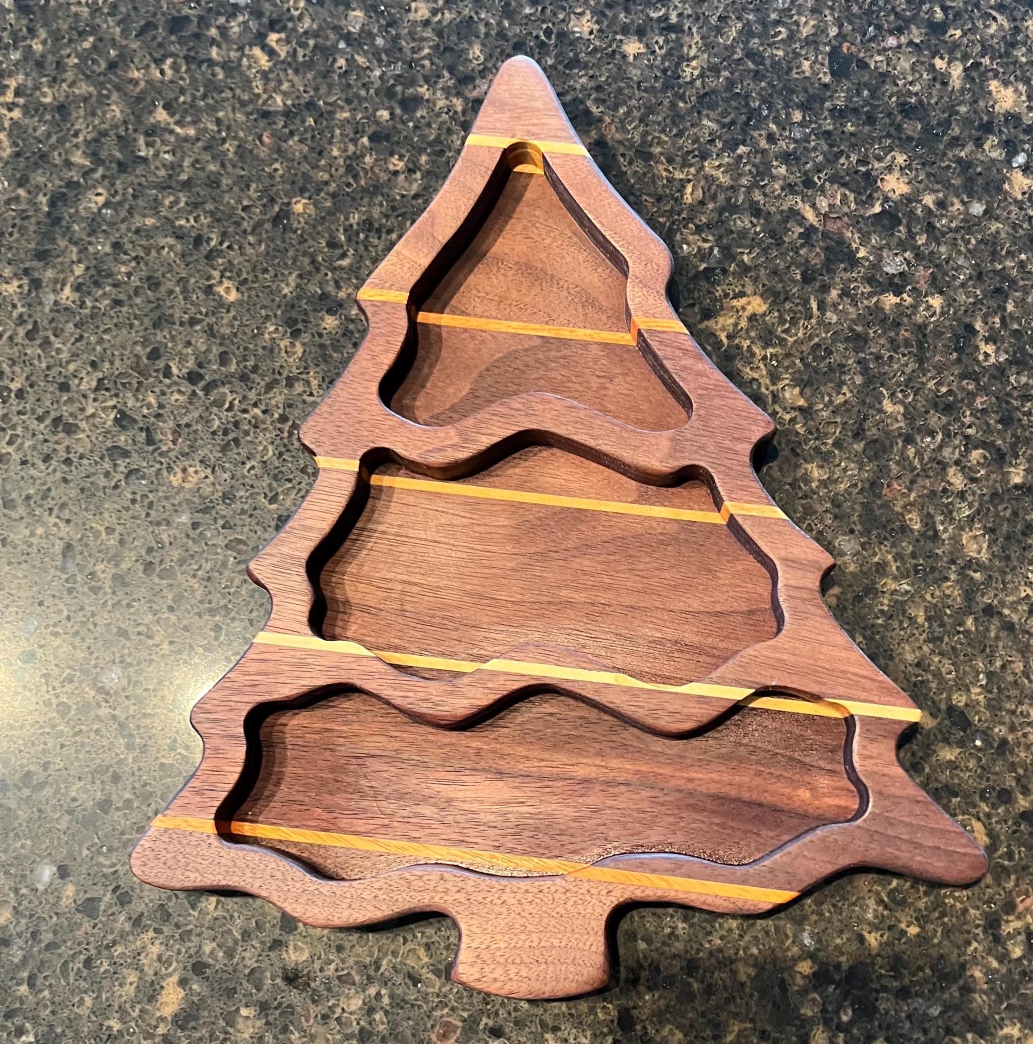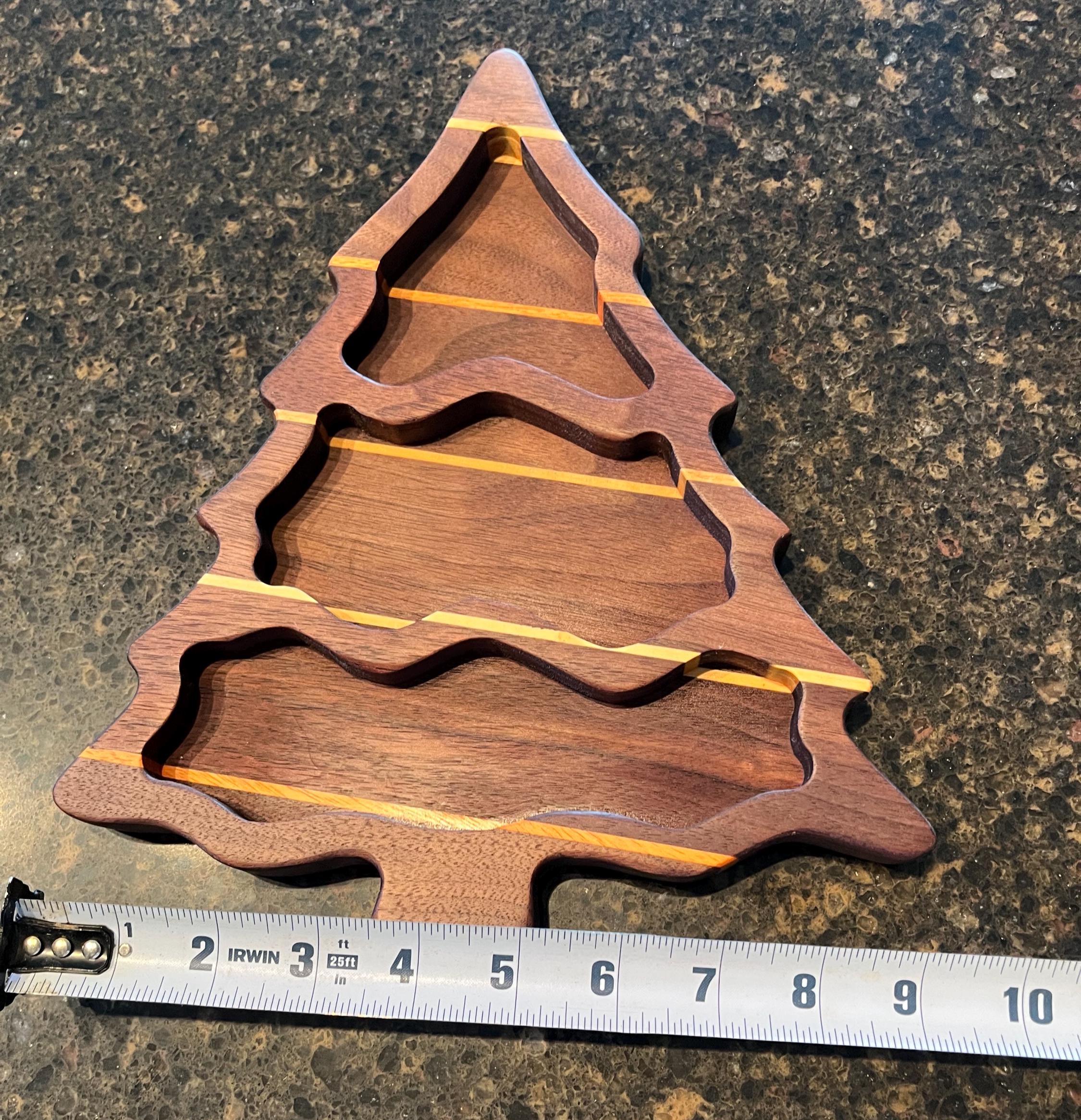 This is a beautiful Christmas Tree Tray or bowl with 3 sections. Made with Black walnut, with exotic canary wood, yellow hart and maple strips to look like the garland. Coated with food safe mineral oil and bees wax. No harsh chemical or stains used. All natural. Makes a great holiday or Christmas gift. Great to have holiday / Christmas treats displayed.