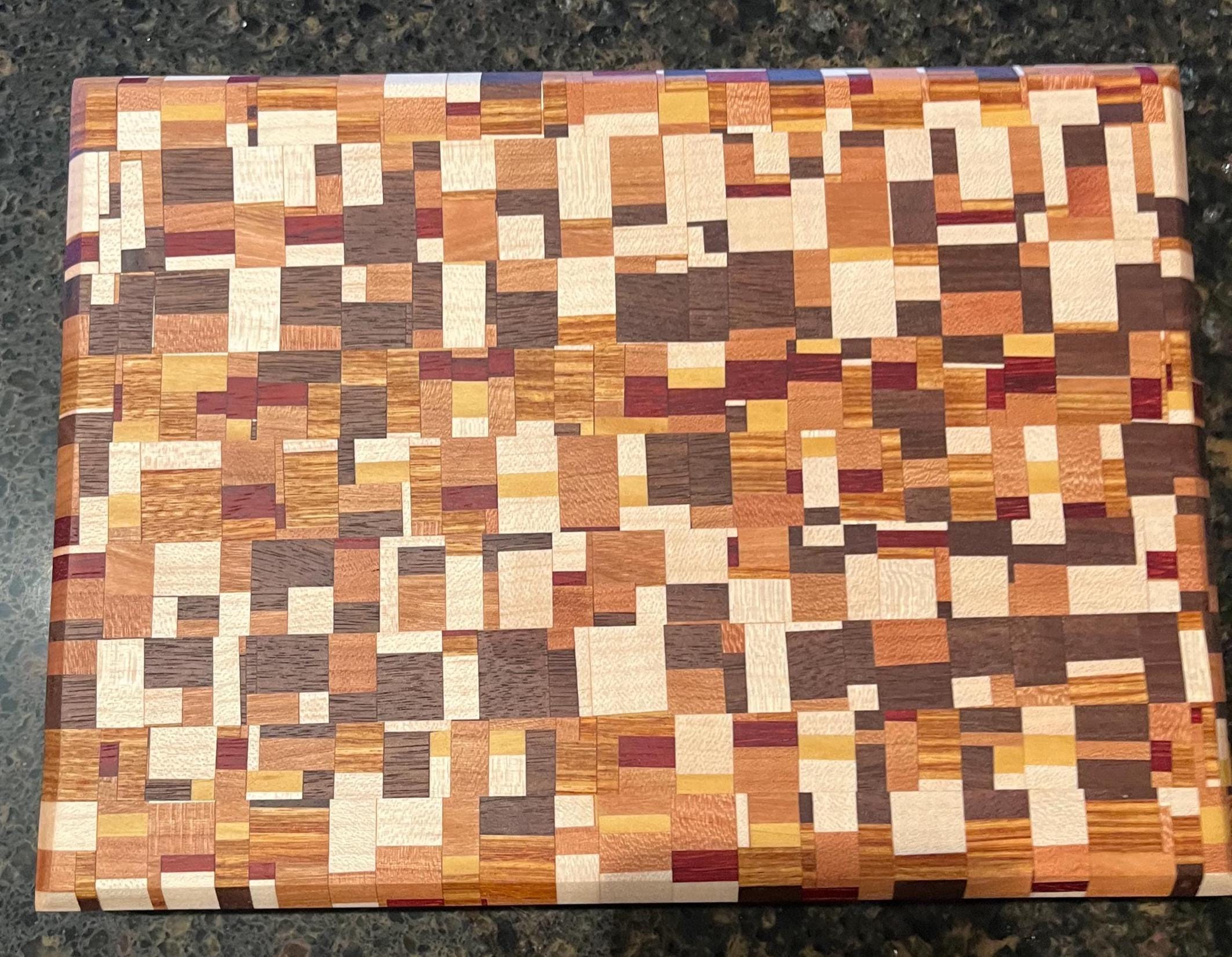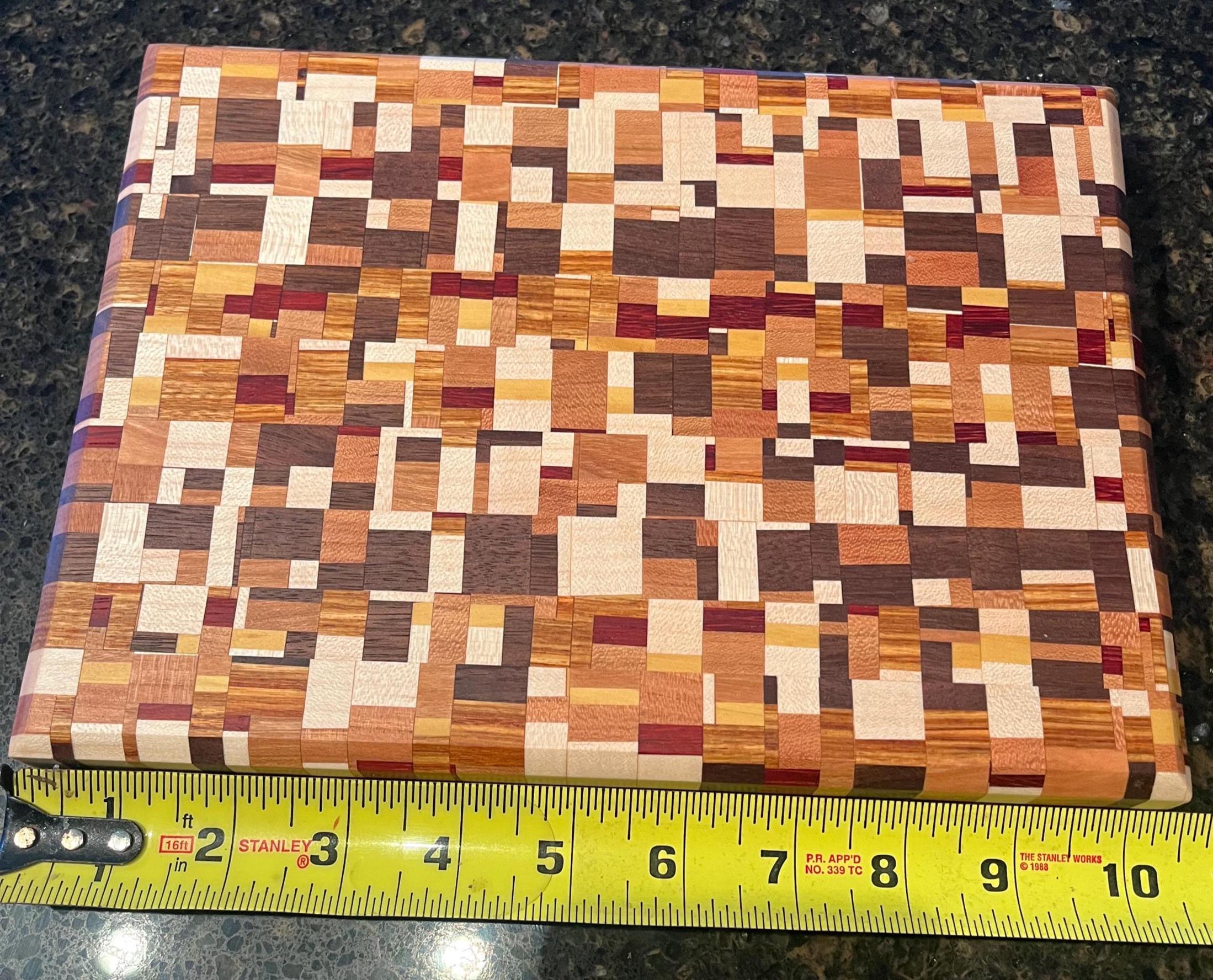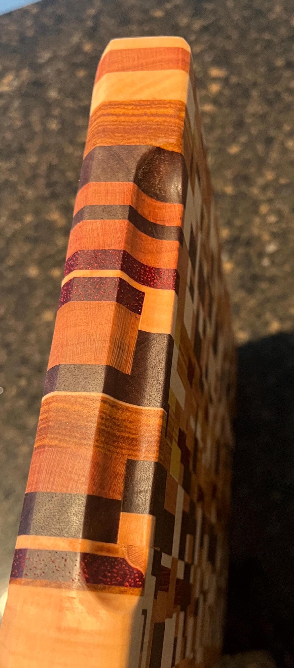 This is a beautiful edge grain cutting board. Can also be used as a charcuterie board, serving tray, or cheese board. Made with maple walnut, cherry, yellowhart and exotic African padauk wood. Sanded with 120, 220 and 320 grit with a water treatment between grades of sandpaper. Board is 10.25 inches wide, 7.5 inches tall and 1.25 inches thick. Given a mineral oil bath and coated with board butter ( that is mineral oil and bees wax. Great for any occasion. Makes a great gift.