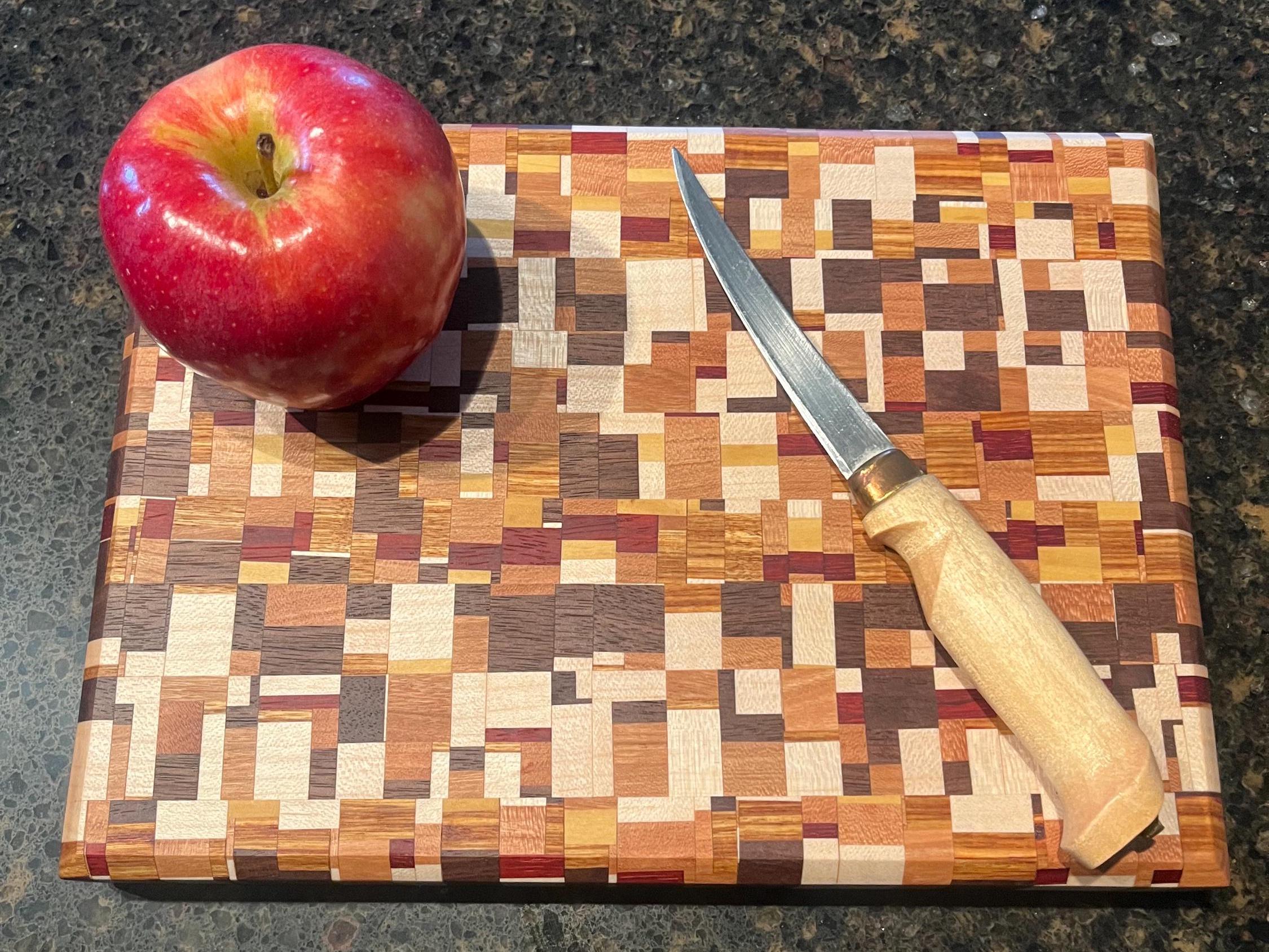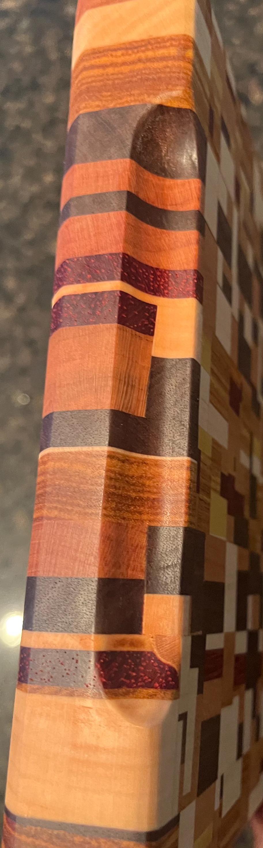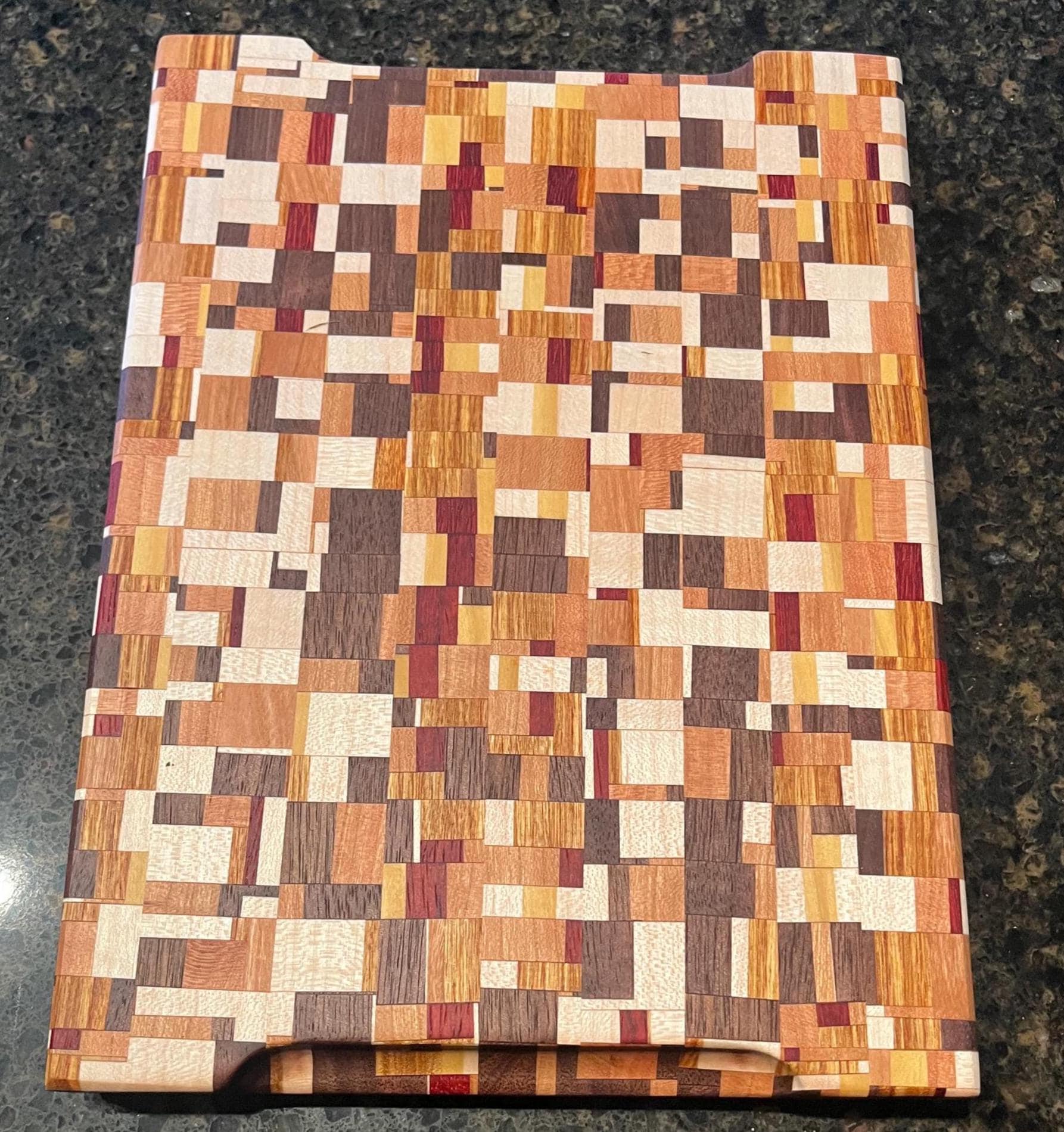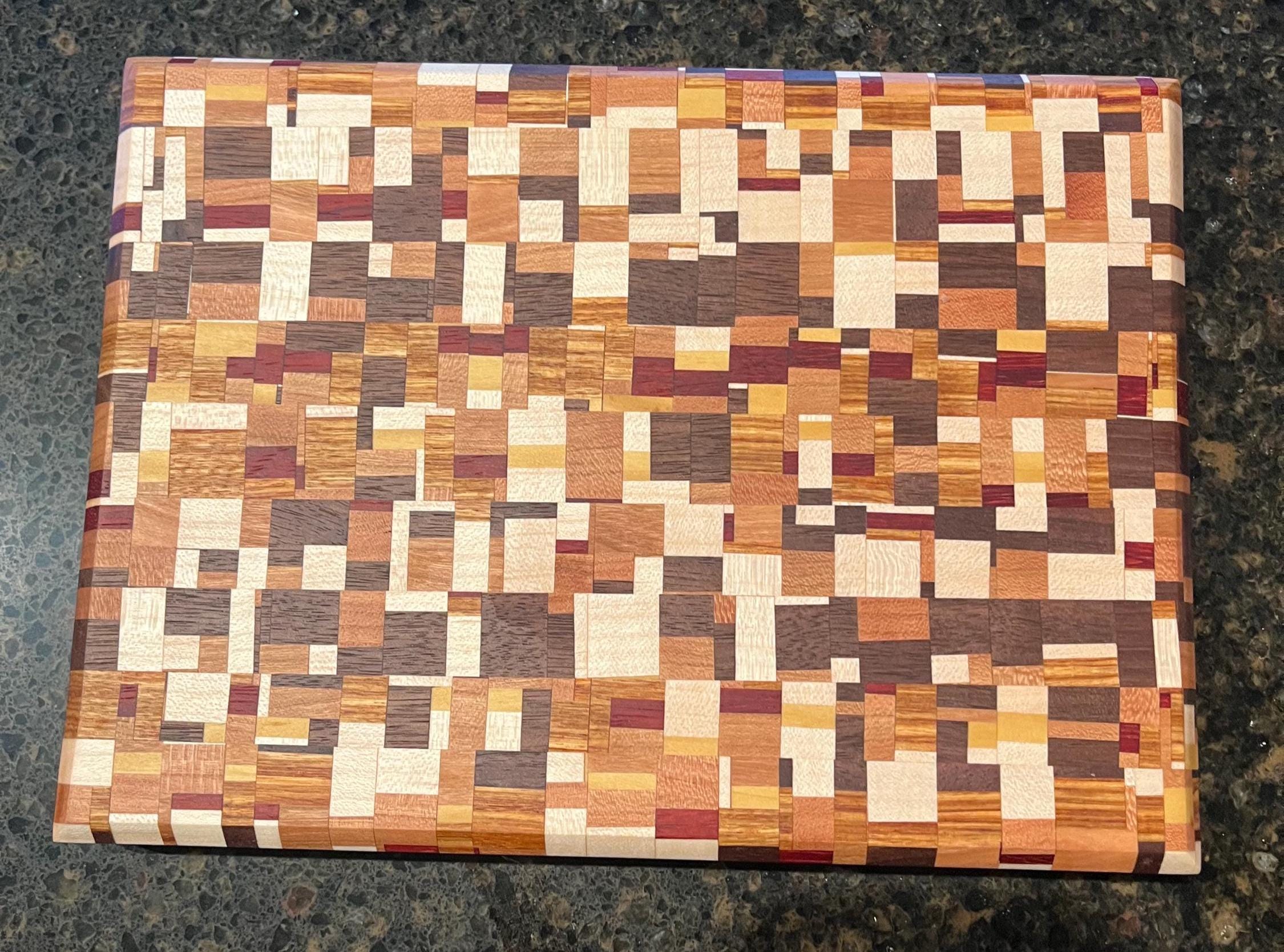 This is a beautiful edge grain cutting board. Can also be used as a charcuterie board, serving tray, or cheese board. Made with maple walnut, cherry, yellowhart and exotic African padauk wood. Sanded with 120, 220 and 320 grit with a water treatment between grades of sandpaper. Board is 10.25 inches wide, 7.5 inches tall and 1.25 inches thick. Given a mineral oil bath and coated with board butter ( that is mineral oil and bees wax. Great for any occasion. Makes a great gift.