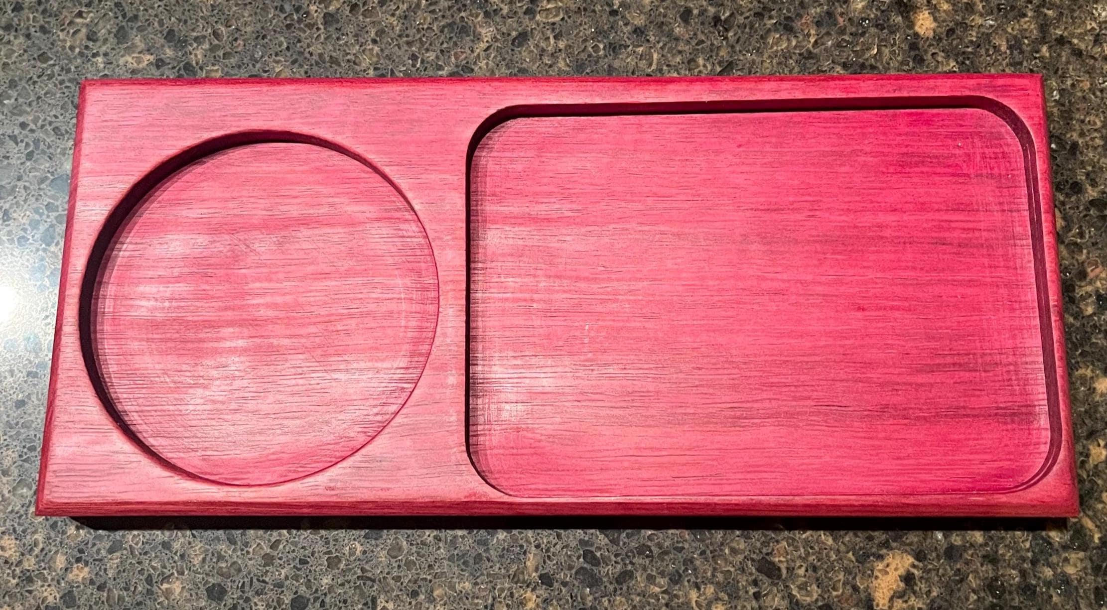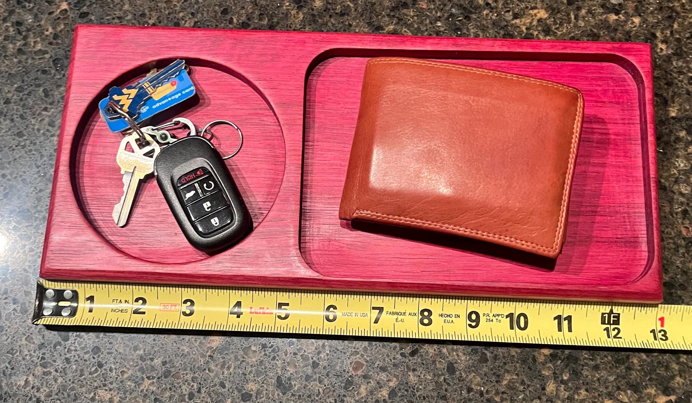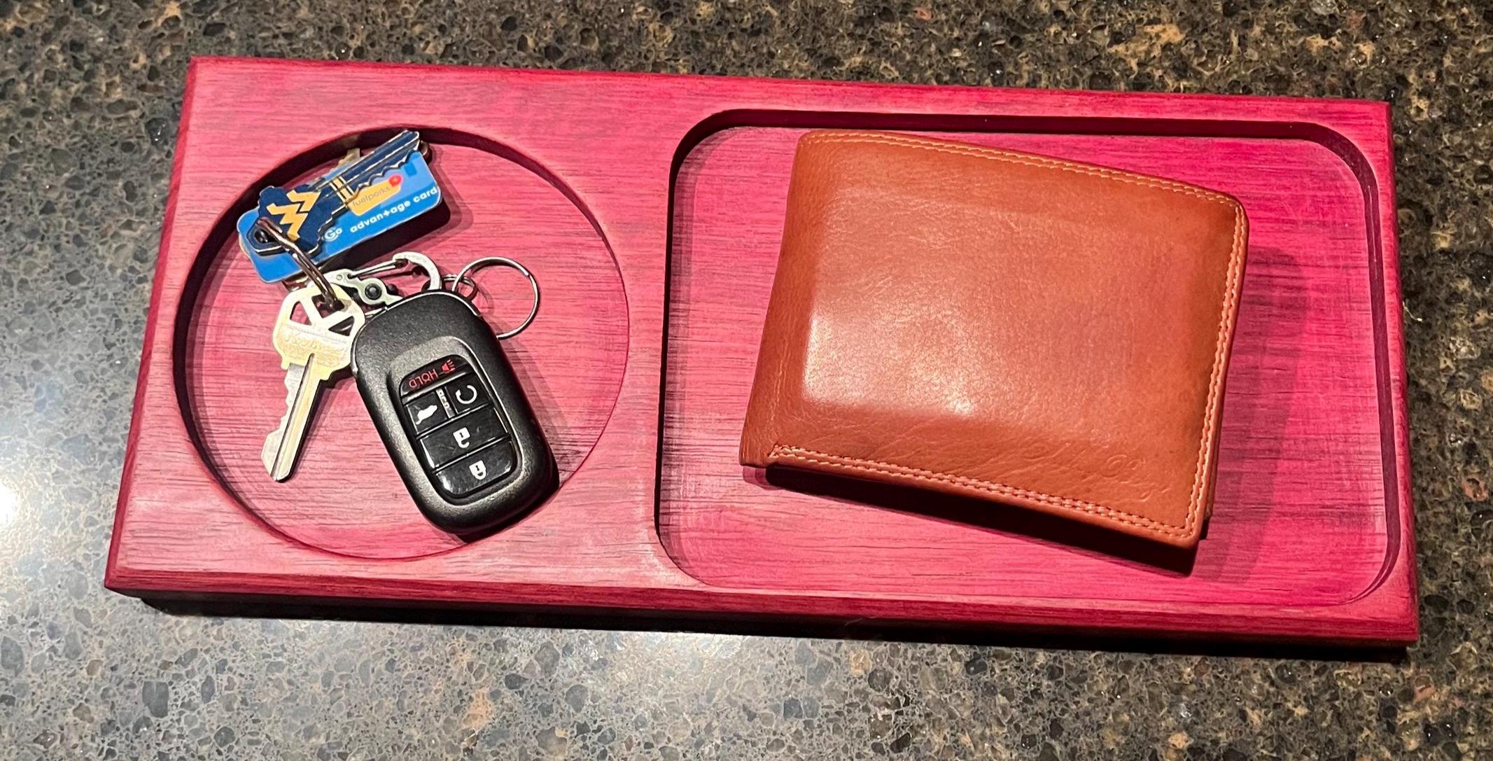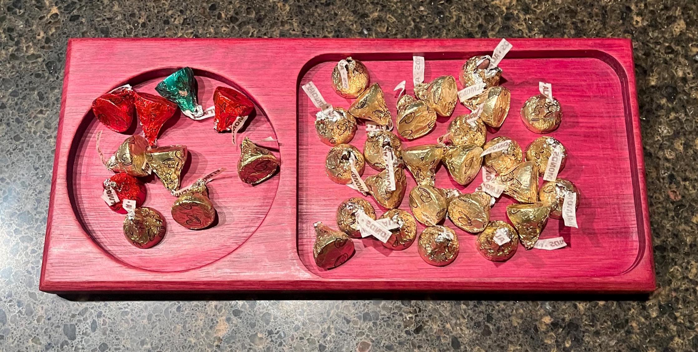 This is a beautiful Catch all for your keys and wallet. Or a Tray or bowl with 2 sections for candy and treats. Made with Exotic purple hart wood. Coated with food safe mineral oil and bees wax. No harsh chemical or stains used. All natural. Makes a great holiday or Christmas gift. Great to have holiday / Christmas treats displayed.