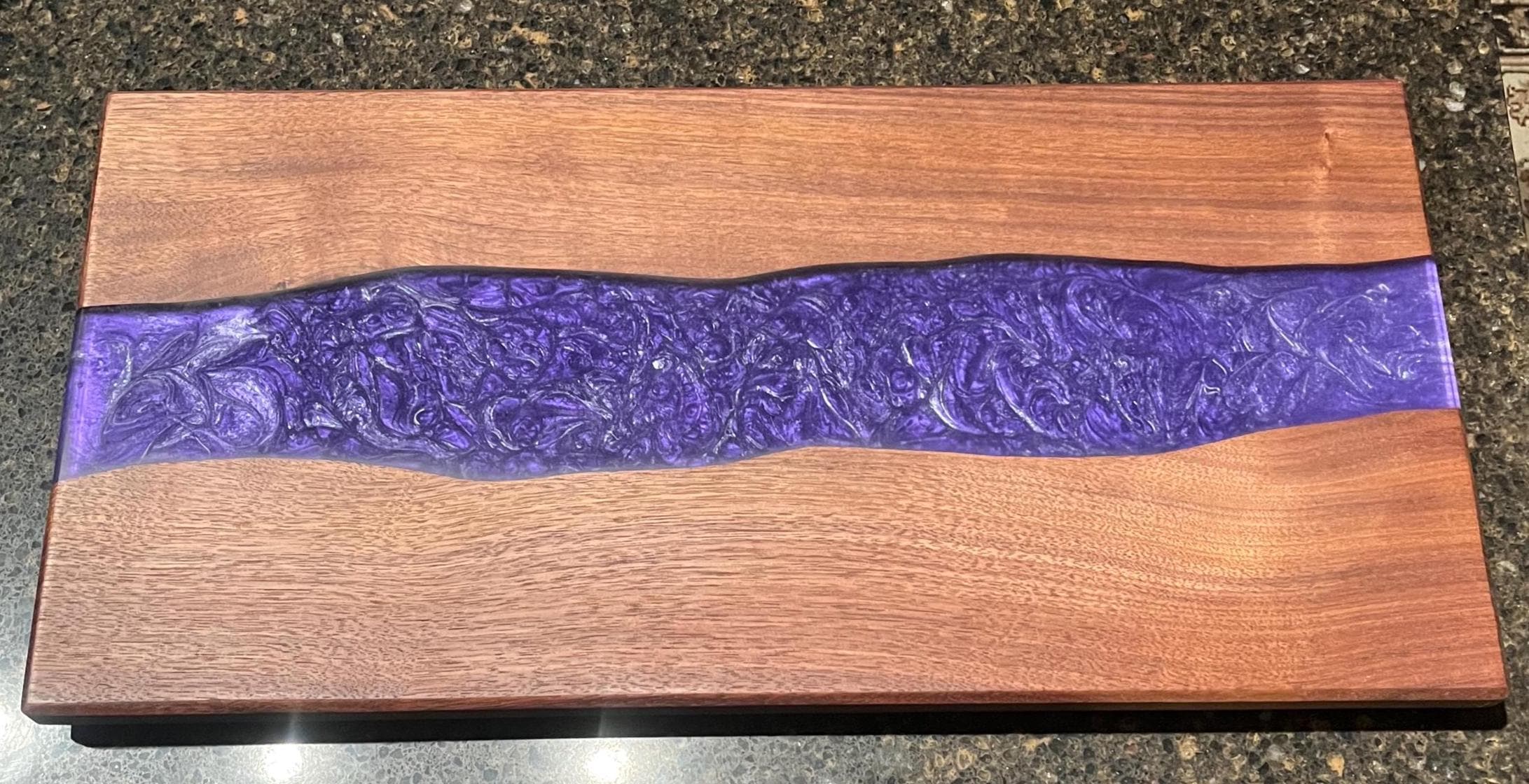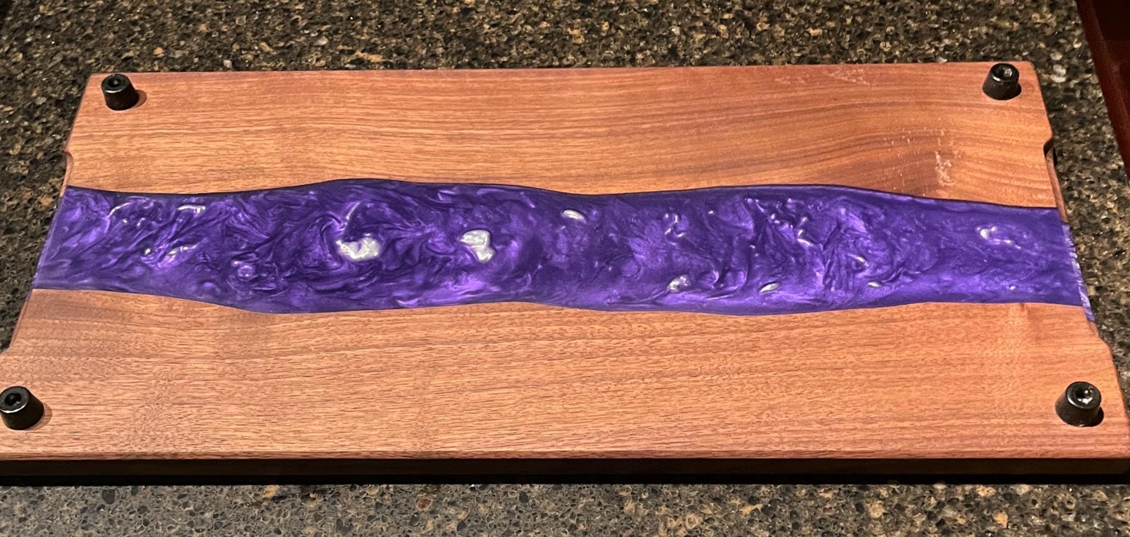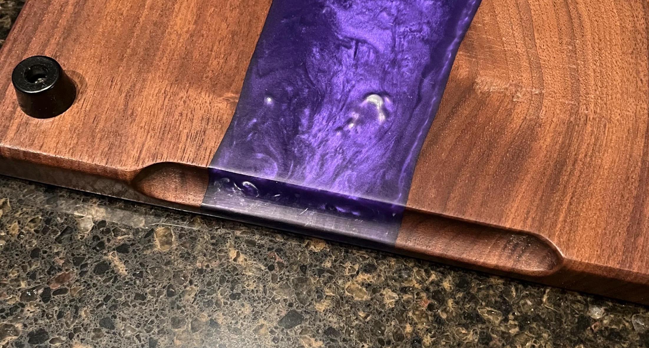 Black Walnut Charcuterie board or serving tray with a purple and silver river. Comes with custom side handles and plastic black feet. Great for any occasion. Makes a great gift. Purple rain river