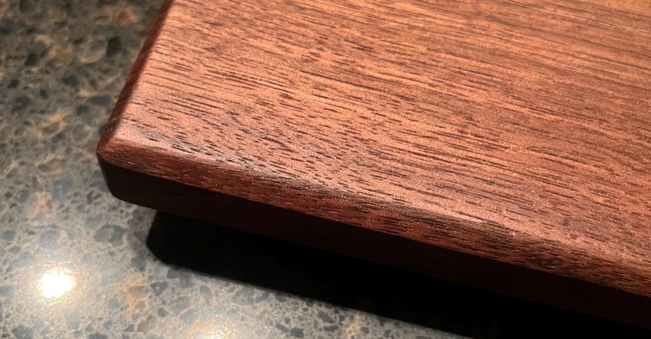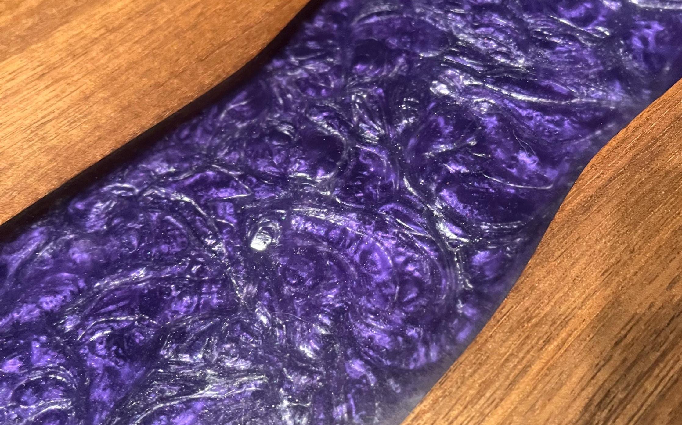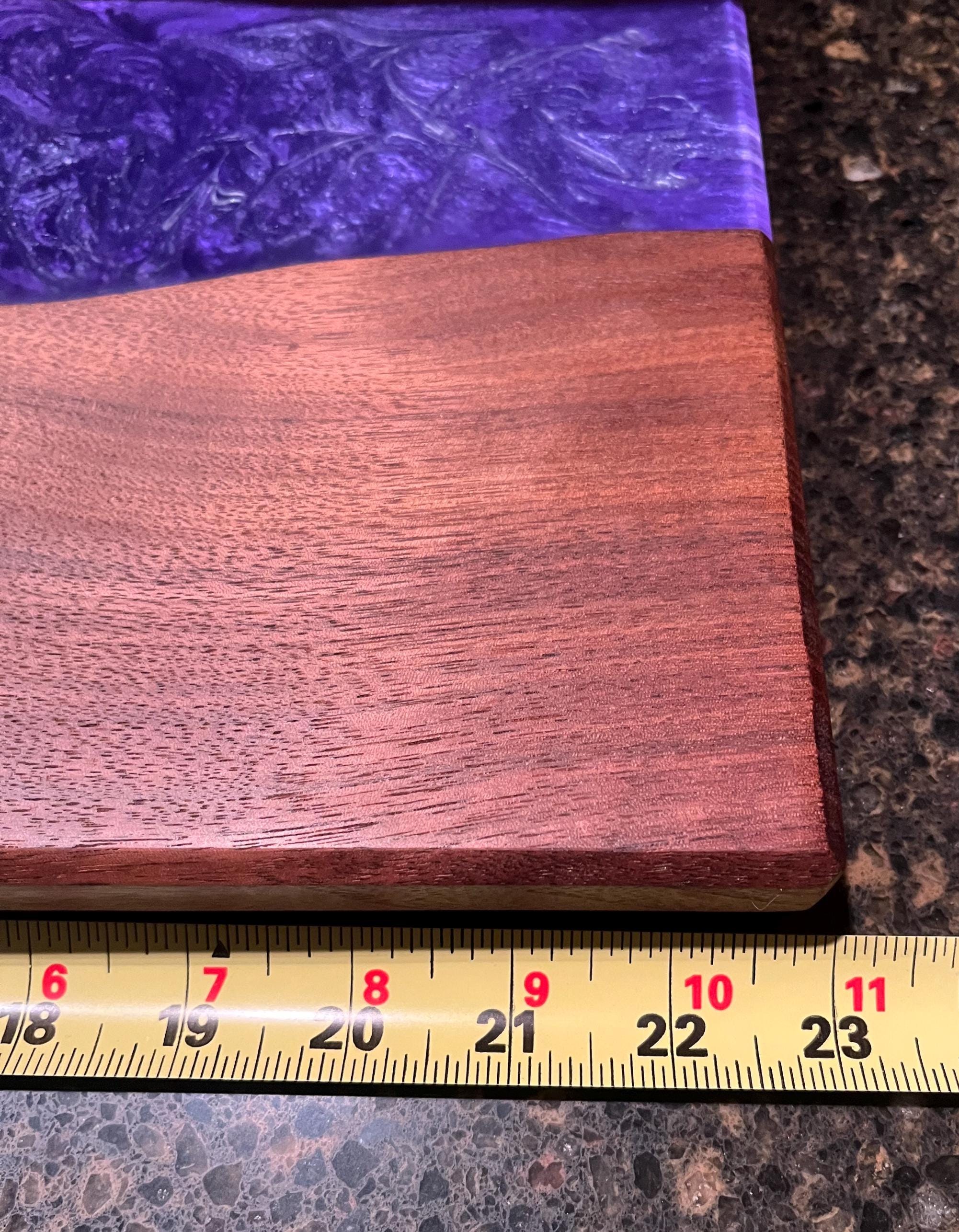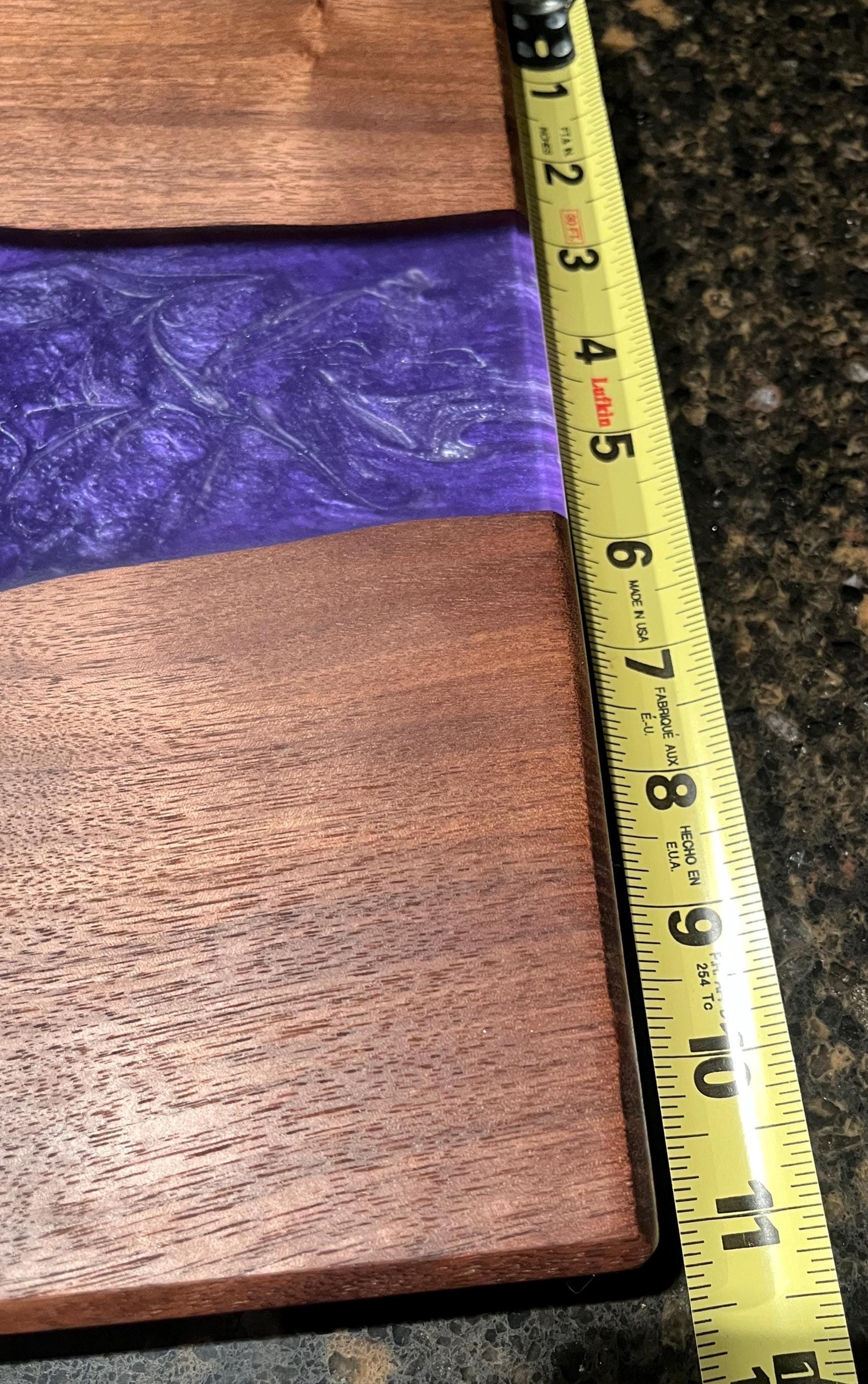 Black Walnut Charcuterie board or serving tray with a purple and silver river. Comes with custom side handles and plastic black feet. Great for any occasion. Makes a great gift. Purple rain river